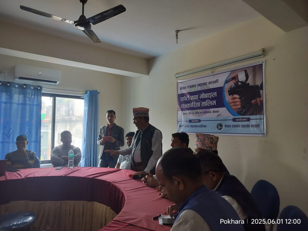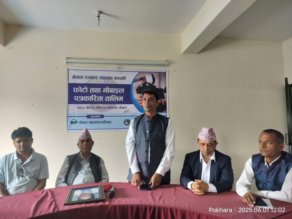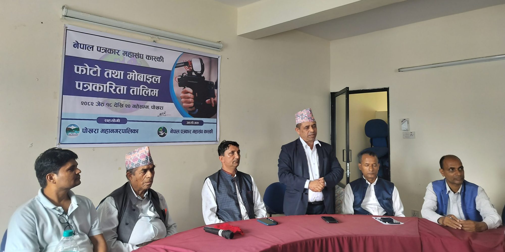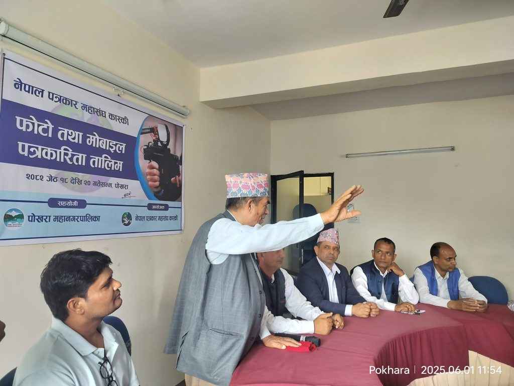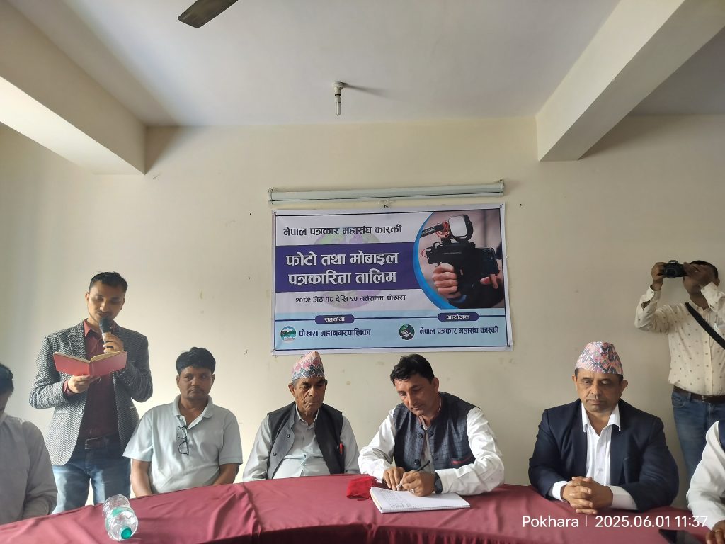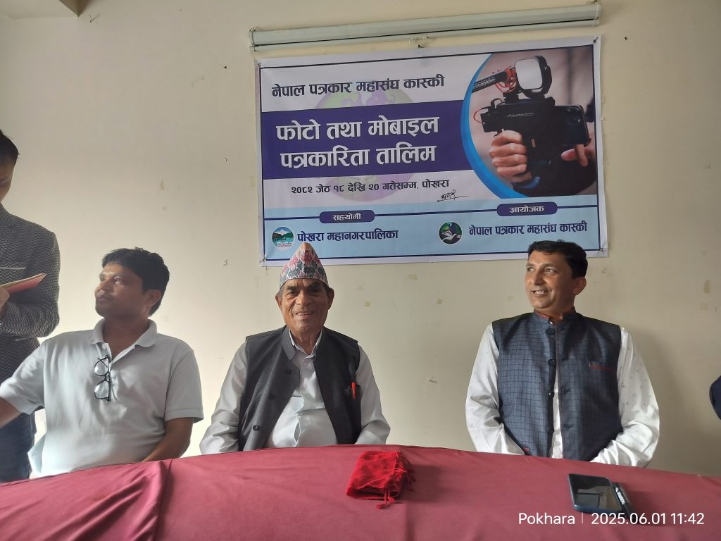 नेपाल पत्रकार महासंघ कास्कीको आयोजना तथा पोखरा महानगरपालिकाको सहयोगमा पत्रकारका लागि फोटो तथा मोबाइल पत्रकारिता तालिम सुरु भएको छ । तालिमको उद्घाटन गर्दै महासंघ कास्कीका संस्थापक अध्यक्ष उमाकान्त शर्माले प्रविधिको विकाससंगै पत्रकारिता वृहत बन्दै गएको बताए । क्षमता अभिवृद्घि तालिमले पत्रकारलाई यस क्षेत्रमा टिकिरहन मदत गर्ने बताए । राज्यको चौथो अंगका रुपमा परिचित पत्रकारिताको धर्म समाजमा भइ रहेका गतिविधि नियाल्दै गलत कार्यमा खबरदारी र झक्झकाउन सक्नु पर्ने बताए ।