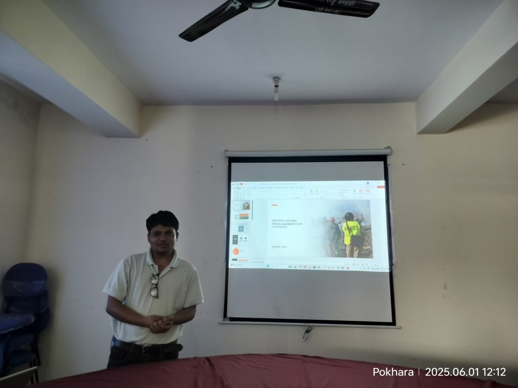 तालिमको पहिलो दिन सहजिकरण गर्दै वरिष्ठ फोटा पत्रकार एवंम संरक्षणकर्मी कृष्णमणी बरालले फोटो पत्रकारिताको आचारसहिता सहित फोटो पत्रकारिता गर्दा आफुले भोगेका चुनौतीका बारेमा अनुभव सुनाए ।