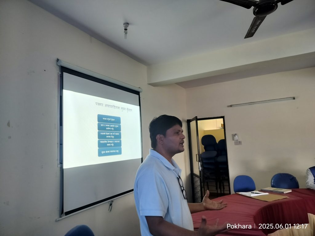 नेपाल पत्रकार महासंघ कास्कीका अध्यक्ष माधब बरालको अध्यक्षतामा सम्पन्न कार्यक्रममा स्वातग महासंघका उपाध्यक्ष एवम प्रशिक्षण विभाग प्रमुख माधव रेग्मी र संचालन सह सचिव मधु अधिकारीले गरेका थिए ।