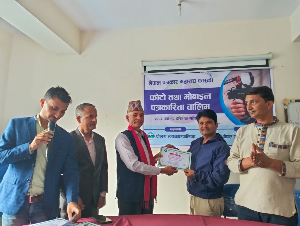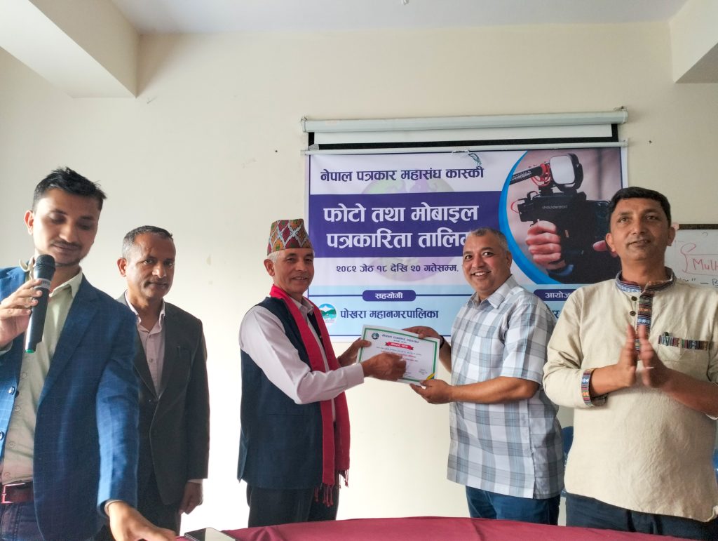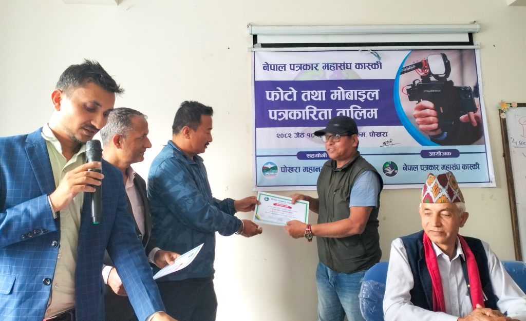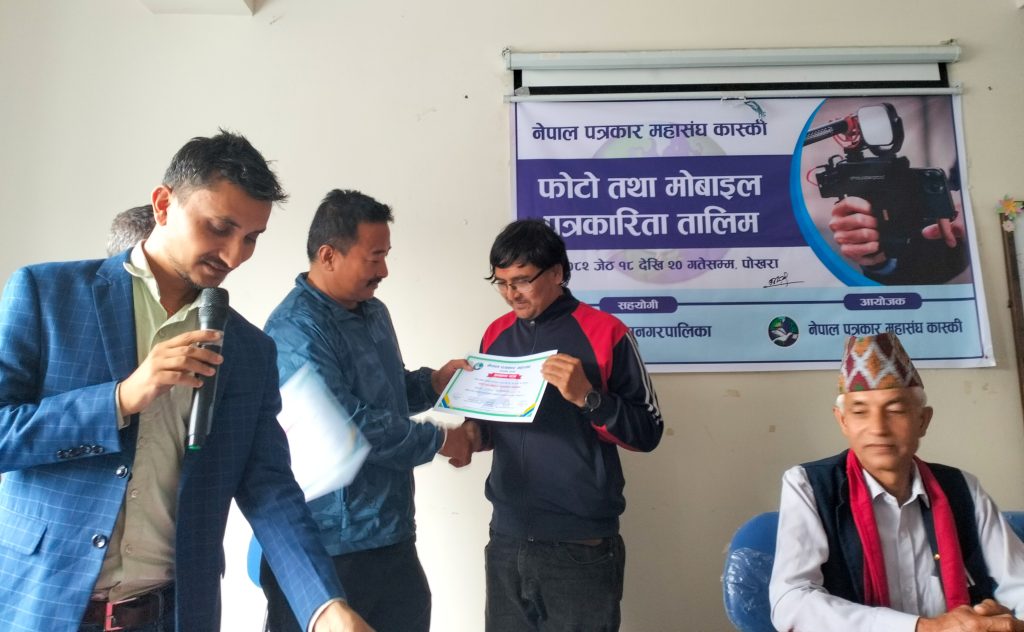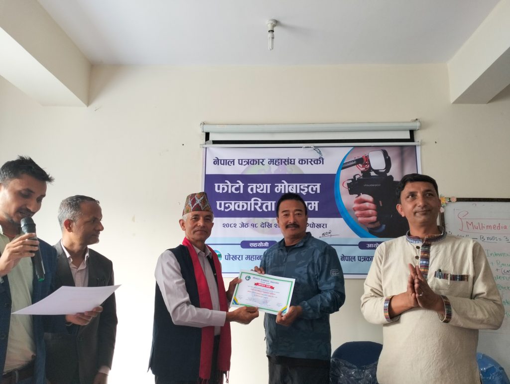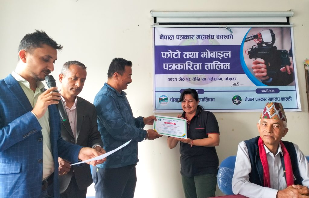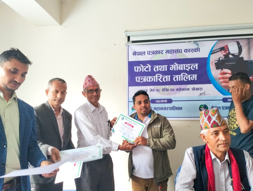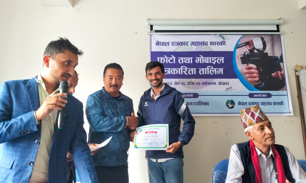 नेपाल पत्रकार महासंघ कास्कीको आयोजना तथा पोखरा महानगरपालिकाको सहयोगमा आयोजित ३ दिने फोटो तथा मोबाइल पत्रकारिता तालिम सम्पन्न भएको छ । समापन सत्रमा बोल्दा जिल्ला समन्वय समिति कास्कीका प्रमुख लिलाधर पौडेलले तालिमले आफ्नो पेशामा निपूर्ण बन्न मदत गर्ने बताए । उनले पत्रकारको कर्मलाई समाजले निग्रनी गरिरहेको हुने बताउदै आफ्नो कर्ममा निश्पक्ष भएर समाचार सम्प्रेषण गर्नु पर्ने बताए । सहभागीको तर्फबाट बोल्दै संचारकर्मी रोजी श्रेष्ठ र राजन उपाध्यायले तालिम छोटो समयको भएता पनि प्रभावकारी भएको बताए । आगामी दिनमा अभ्यास सहितको तालिम प्रदान गर्न आयोजकलाई आग्रह गरे । प्रमुख प्रशिक्षक वरिष्ठ फोटो पत्रकार एवं मोवाइल पत्रकारिता विशेषज्ञ विकास कार्कीले फोटो, भिडियोका लागि मोवाइलको उच्चतम प्रयोग गर्न सकिने बारे प्रशिक्षित गरे । वरिष्ठ फोटो पत्रकार राम गुरुङ र कृष्णमणि बरालले पत्रकारितामा फोटो पत्रकारिताको महत्व सहित आफ्नो अनुभव सहित सहजिकरण गरे ।