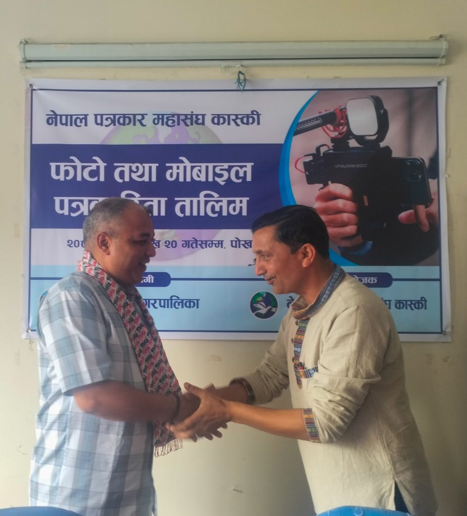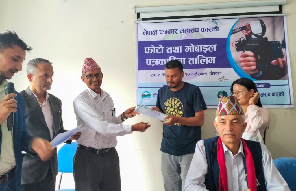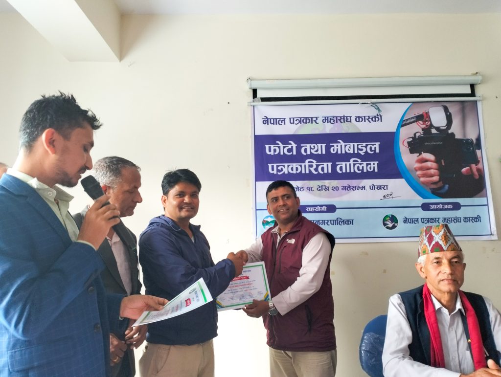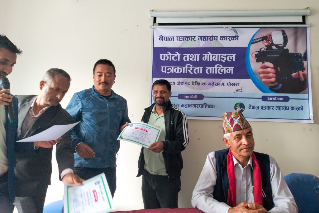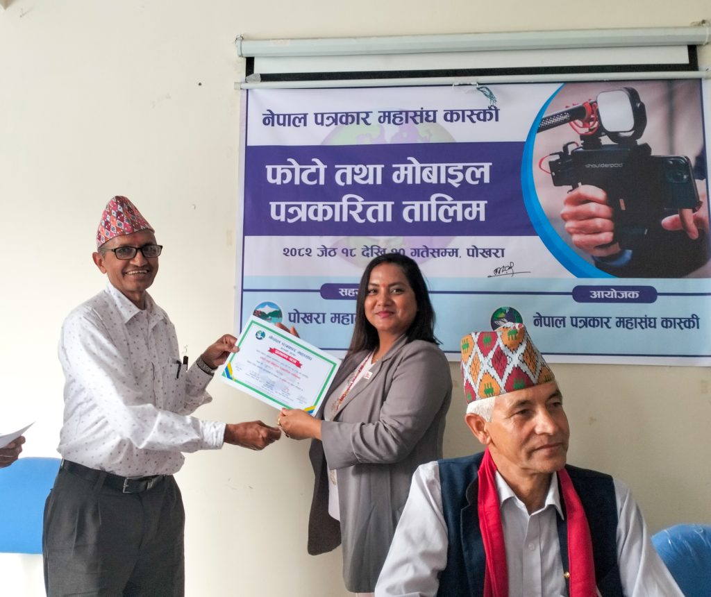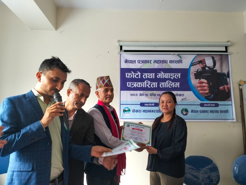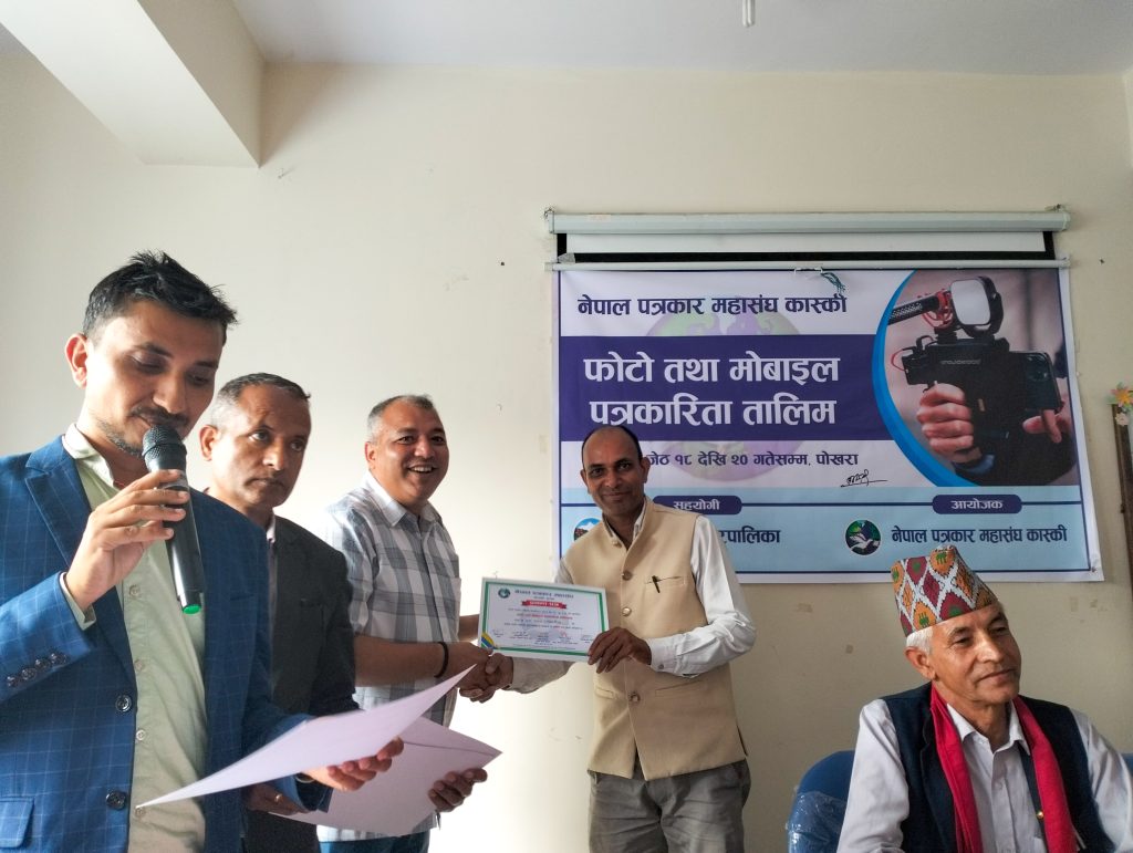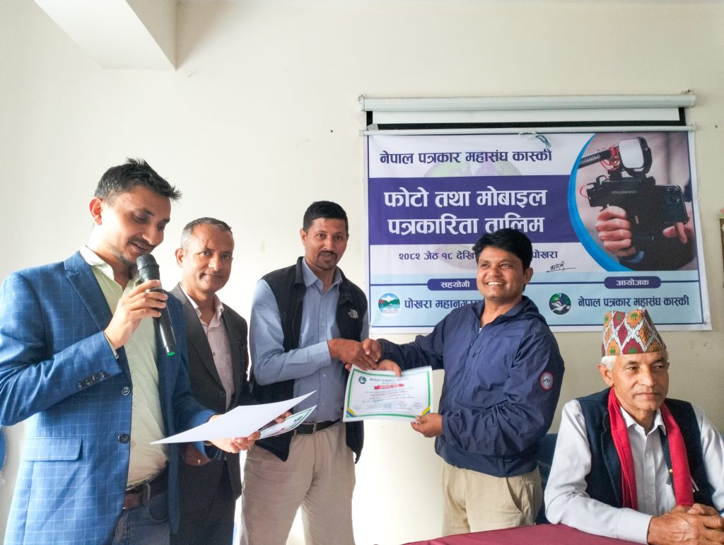 नेपाल पत्रकार महासंघ कास्कीको आयोजना तथा पोखरा महानगरपालिकाको सहयोगमा आयोजित ३ दिने फोटो तथा मोबाइल पत्रकारिता तालिम सम्पन्न भएको छ । समापन सत्रमा बोल्दा जिल्ला समन्वय समिति कास्कीका प्रमुख लिलाधर पौडेलले तालिमले आफ्नो पेशामा निपूर्ण बन्न मदत गर्ने बताए । उनले पत्रकारको कर्मलाई समाजले निग्रनी गरिरहेको हुने बताउदै आफ्नो कर्ममा निश्पक्ष भएर समाचार सम्प्रेषण गर्नु पर्ने बताए । सहभागीको तर्फबाट बोल्दै संचारकर्मी रोजी श्रेष्ठ र राजन उपाध्यायले तालिम छोटो समयको भएता पनि प्रभावकारी भएको बताए । आगामी दिनमा अभ्यास सहितको तालिम प्रदान गर्न आयोजकलाई आग्रह गरे । प्रमुख प्रशिक्षक वरिष्ठ फोटो पत्रकार एवं मोवाइल पत्रकारिता विशेषज्ञ विकास कार्कीले फोटो, भिडियोका लागि मोवाइलको उच्चतम प्रयोग गर्न सकिने बारे प्रशिक्षित गरे । वरिष्ठ फोटो पत्रकार राम गुरुङ र कृष्णमणि बरालले पत्रकारितामा फोटो पत्रकारिताको महत्व सहित आफ्नो अनुभव सहित सहजिकरण गरे ।