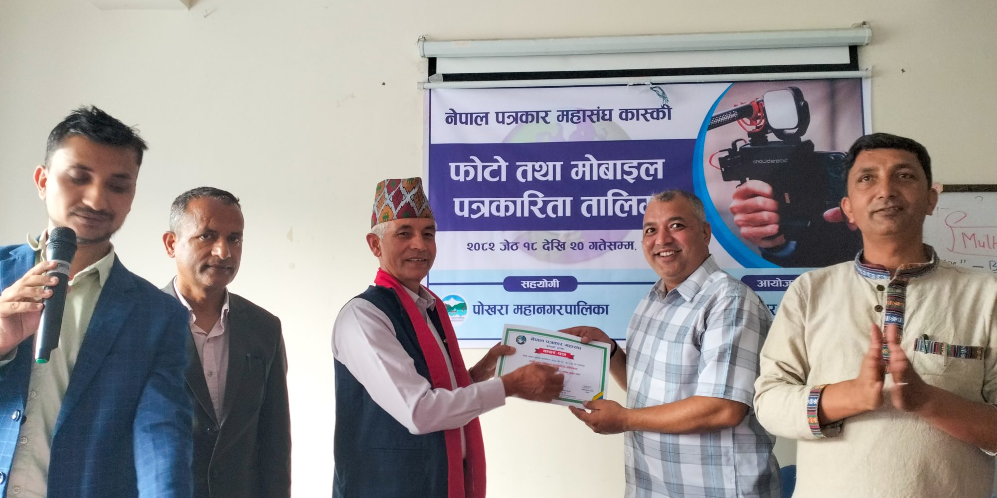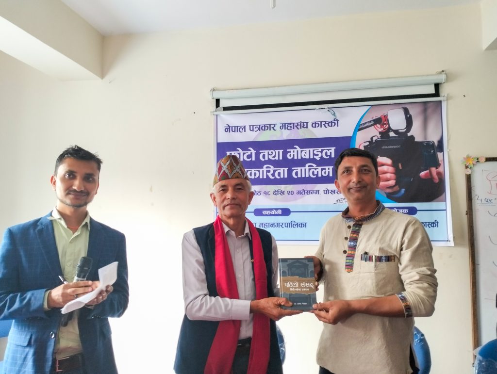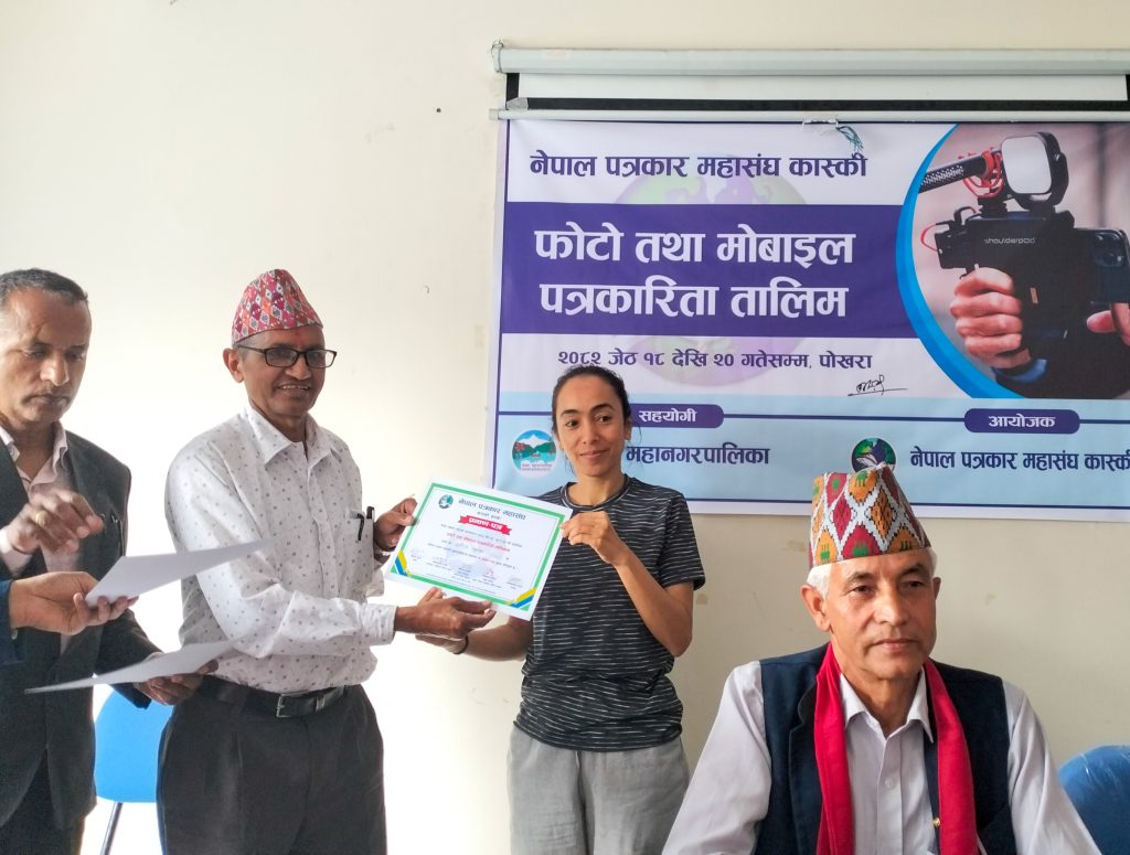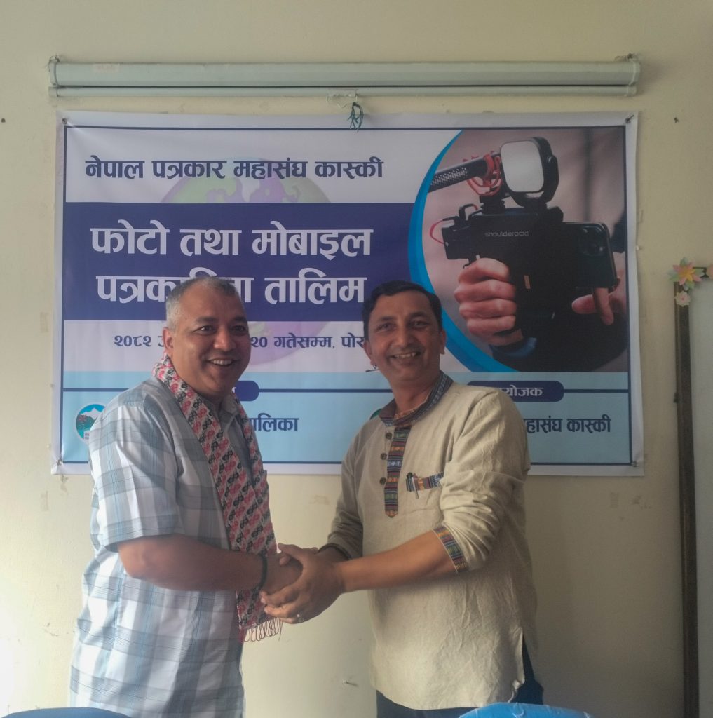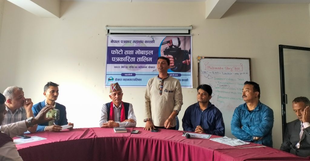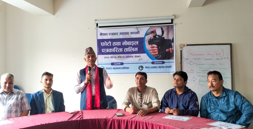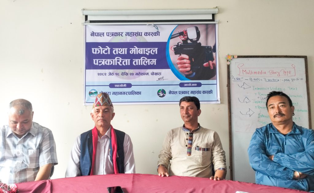 नेपाल पत्रकार महासंघ कास्कीको आयोजना तथा पोखरा महानगरपालिकाको सहयोगमा आयोजित ३ दिने फोटो तथा मोबाइल पत्रकारिता तालिम सम्पन्न भएको छ । समापन सत्रमा बोल्दा जिल्ला समन्वय समिति कास्कीका प्रमुख लिलाधर पौडेलले तालिमले आफ्नो पेशामा निपूर्ण बन्न मदत गर्ने बताए । उनले पत्रकारको कर्मलाई समाजले निग्रनी गरिरहेको हुने बताउदै आफ्नो कर्ममा निश्पक्ष भएर समाचार सम्प्रेषण गर्नु पर्ने बताए । सहभागीको तर्फबाट बोल्दै संचारकर्मी रोजी श्रेष्ठ र राजन उपाध्यायले तालिम छोटो समयको भएता पनि प्रभावकारी भएको बताए । आगामी दिनमा अभ्यास सहितको तालिम प्रदान गर्न आयोजकलाई आग्रह गरे । प्रमुख प्रशिक्षक वरिष्ठ फोटो पत्रकार एवं मोवाइल पत्रकारिता विशेषज्ञ विकास कार्कीले फोटो, भिडियोका लागि मोवाइलको उच्चतम प्रयोग गर्न सकिने बारे प्रशिक्षित गरे । वरिष्ठ फोटो पत्रकार राम गुरुङ र कृष्णमणि बरालले पत्रकारितामा फोटो पत्रकारिताको महत्व सहित आफ्नो अनुभव सहित सहजिकरण गरे ।